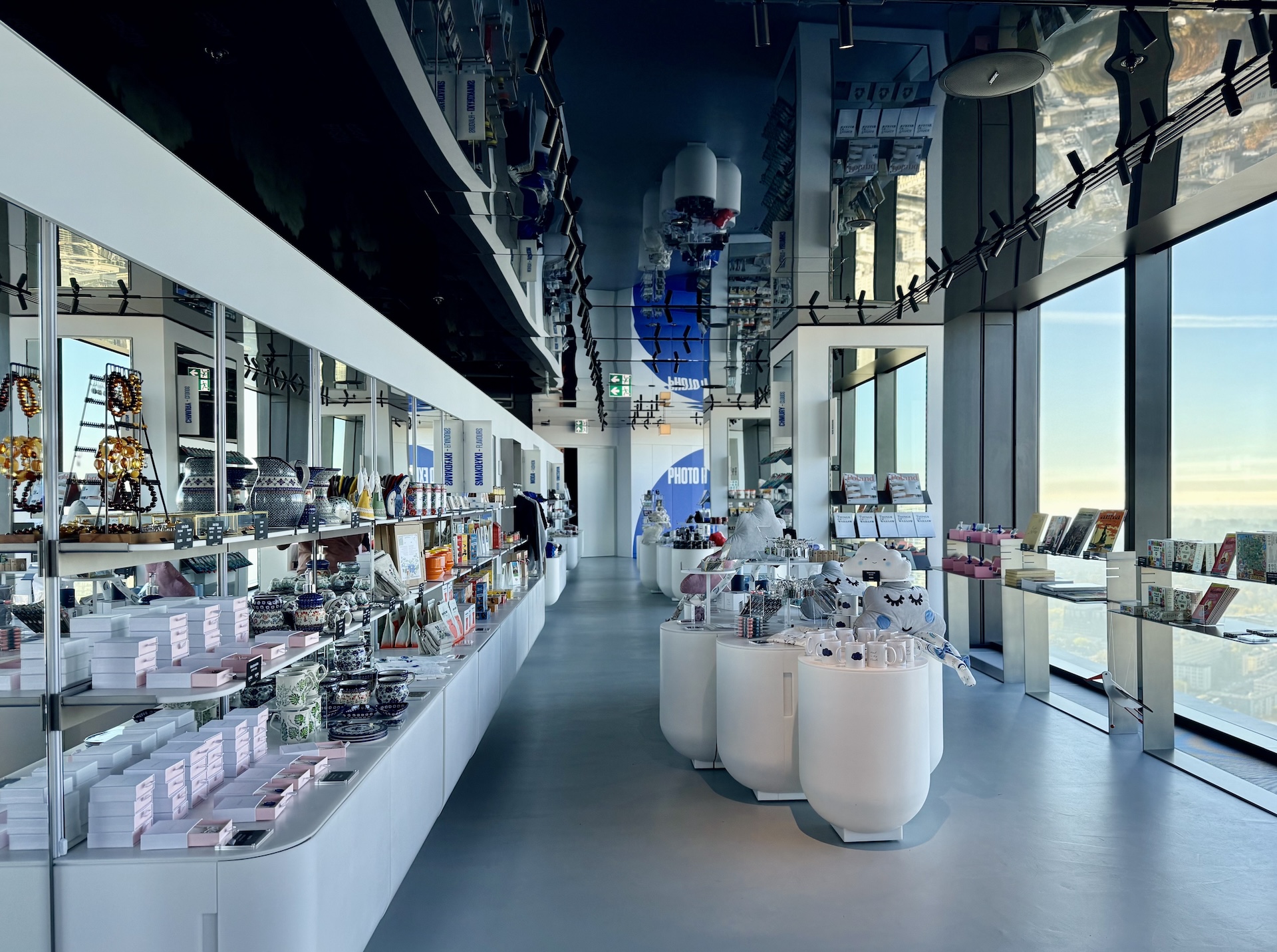 What makes the biggest impression on visitors, however, is the entertainment and viewing area awaiting them on the upper floors. On the 46th floor, Tétris, together with set designer Clemence Farrell, created a souvenir shop and an immersive corridor.Thanks to mirrors, cloud prints and interactive projectors, visitors experience there the illusion of walking above the city, giving them a unique perspective of the capital. The Experience Room, on the other hand, is a unique multimedia space with screens built into the floor, mirrored surfaces and stretch ceilings, which together create an evocative visual experience.