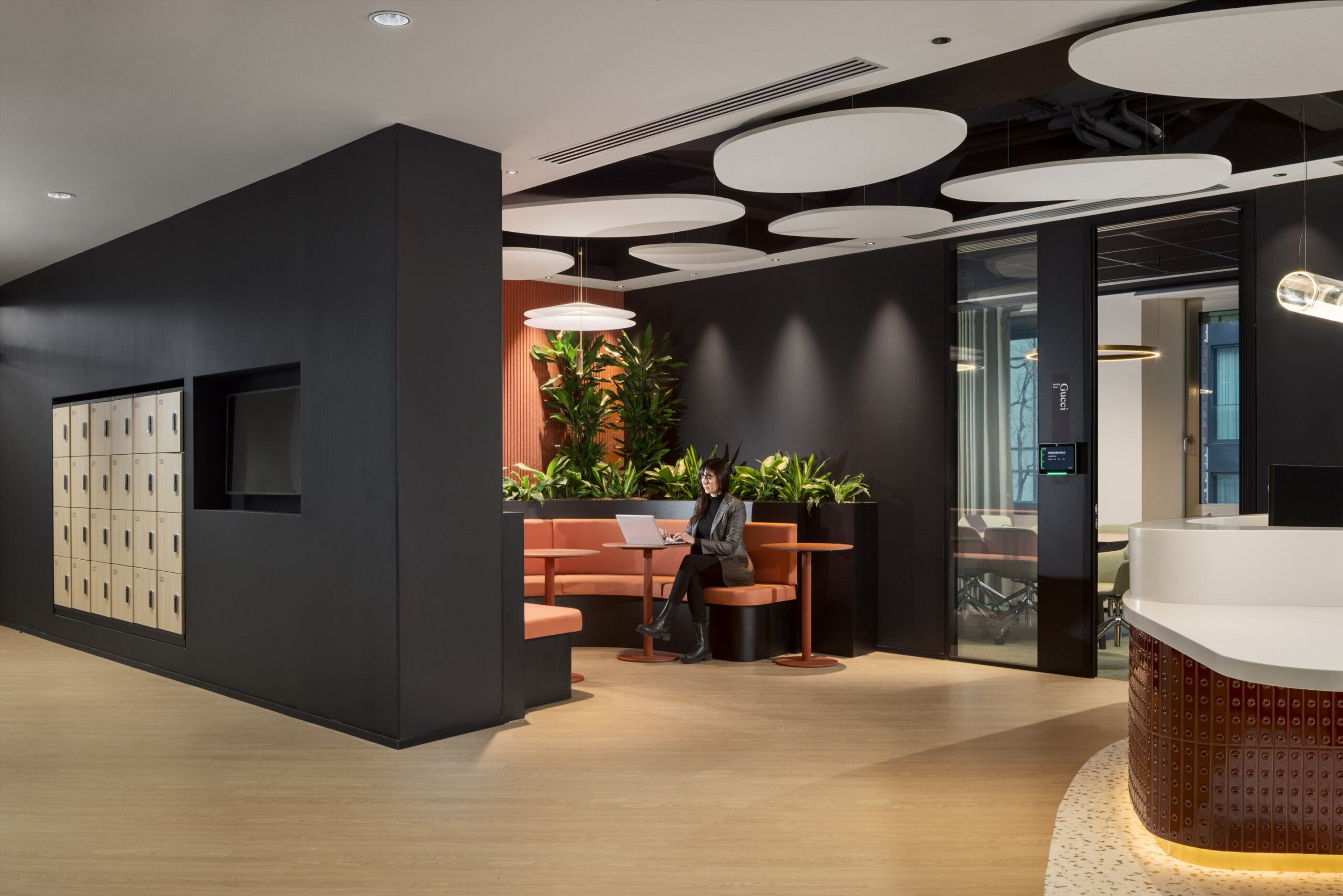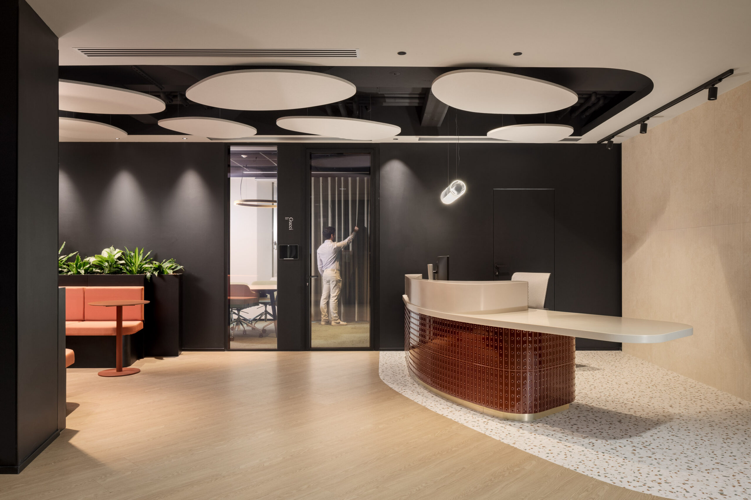 The reception area, featuring a curved counter with geometric-patterned ceramic cladding, creates a distinctive corporate entrance.