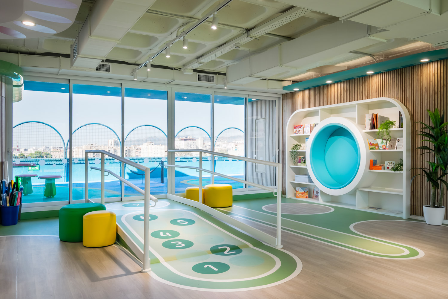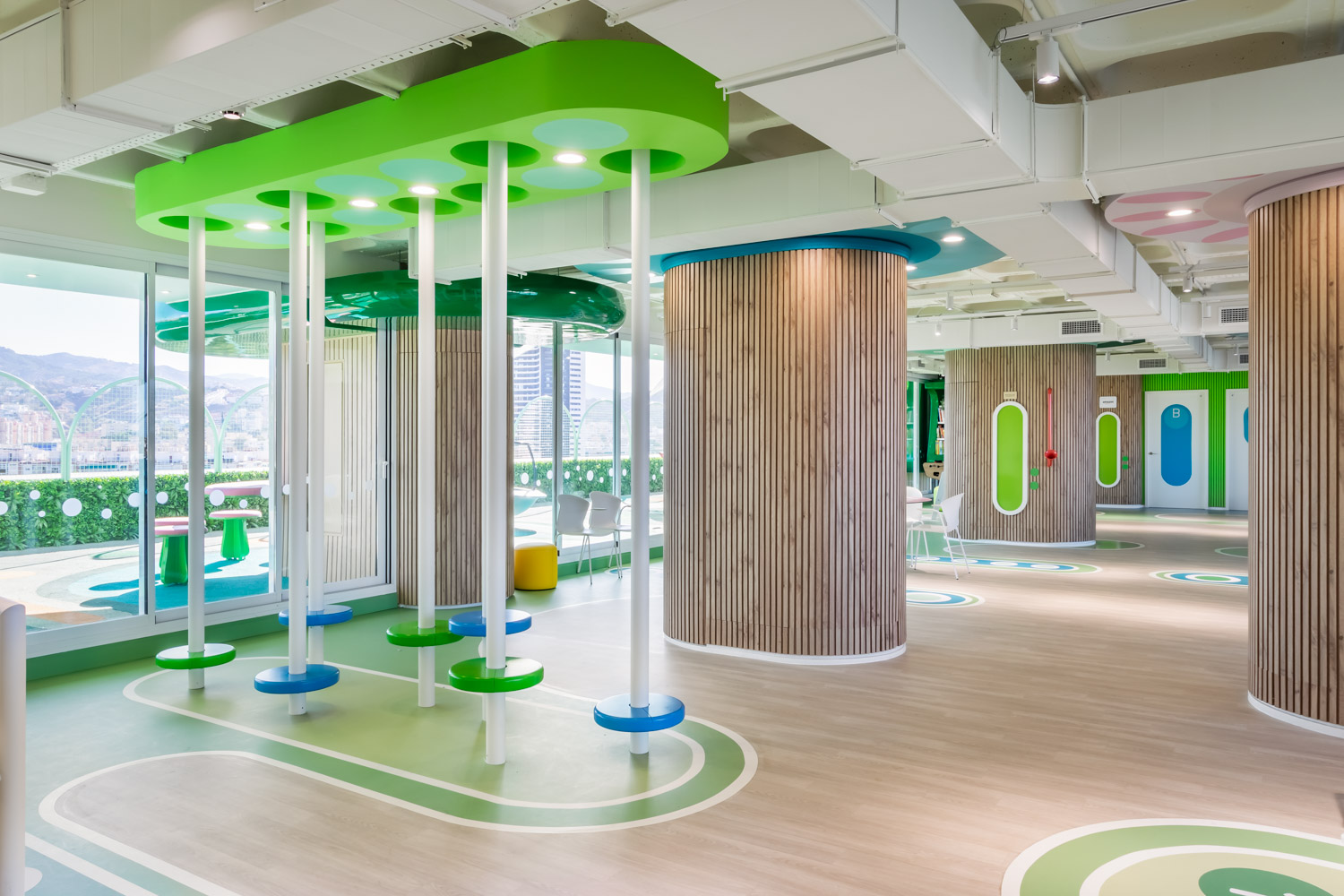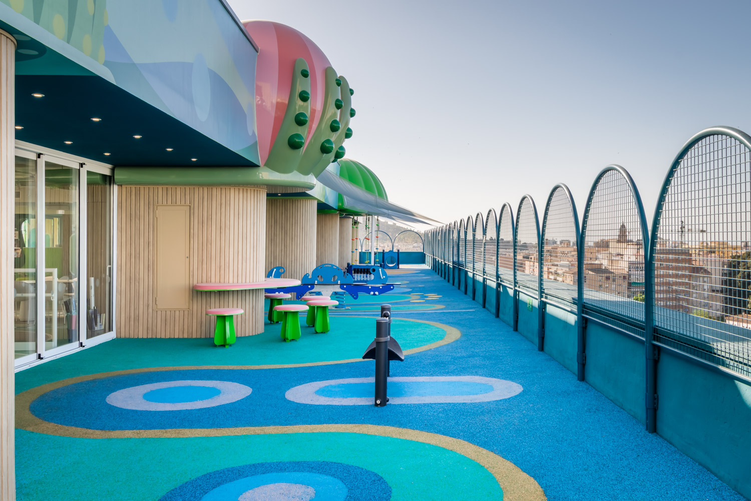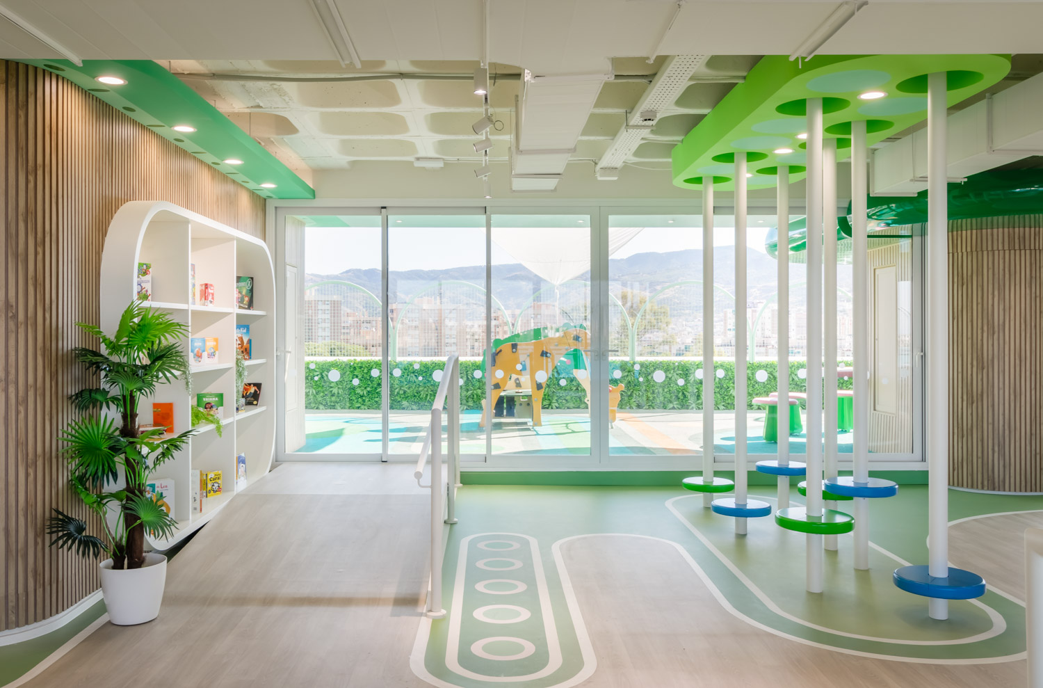 The project required the creation of interior areas with children's classrooms and play zones, in addition to two distinctive terraces: "The Enchanted Valley" on the north terrace and "Ocean Waves" on the south terrace.