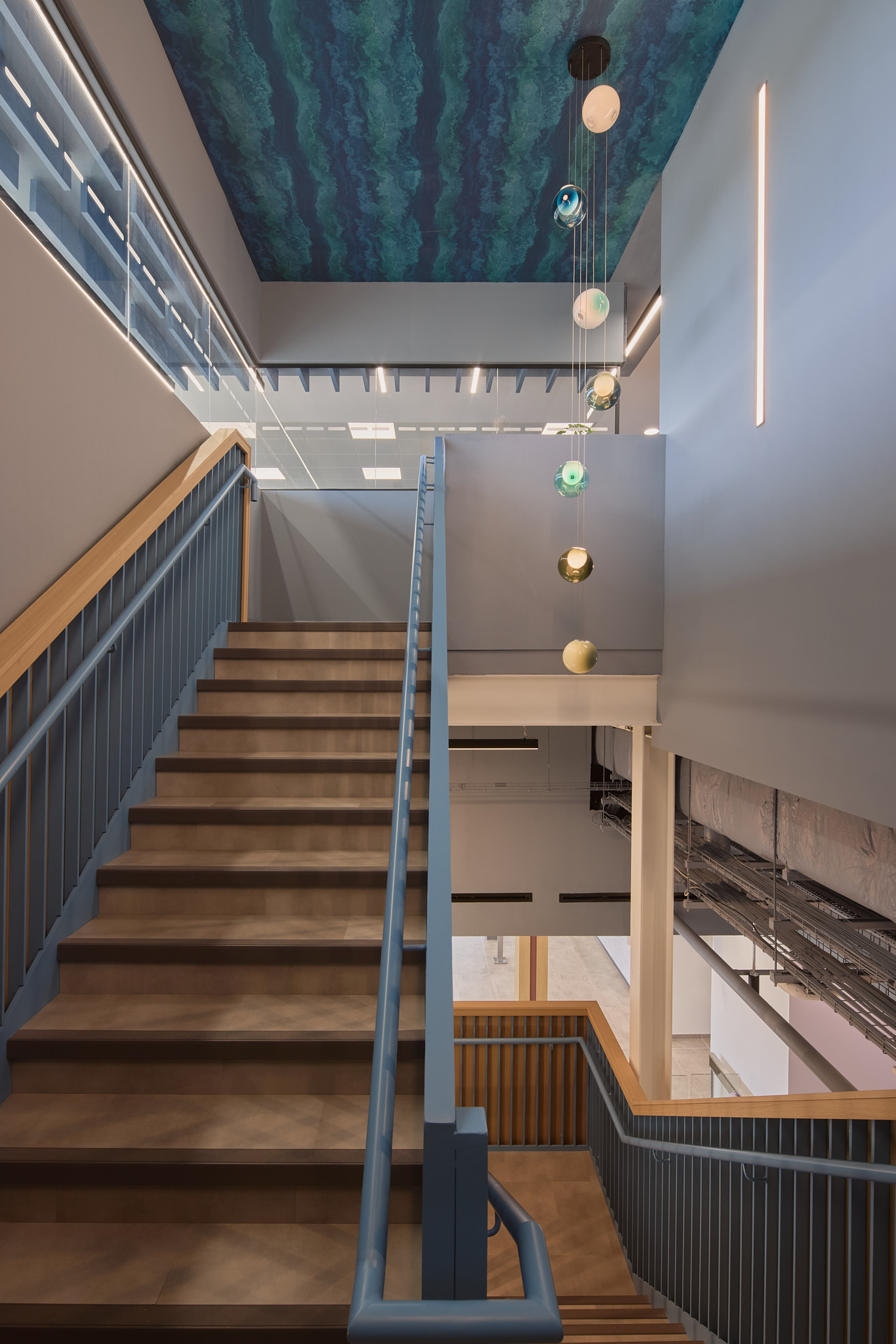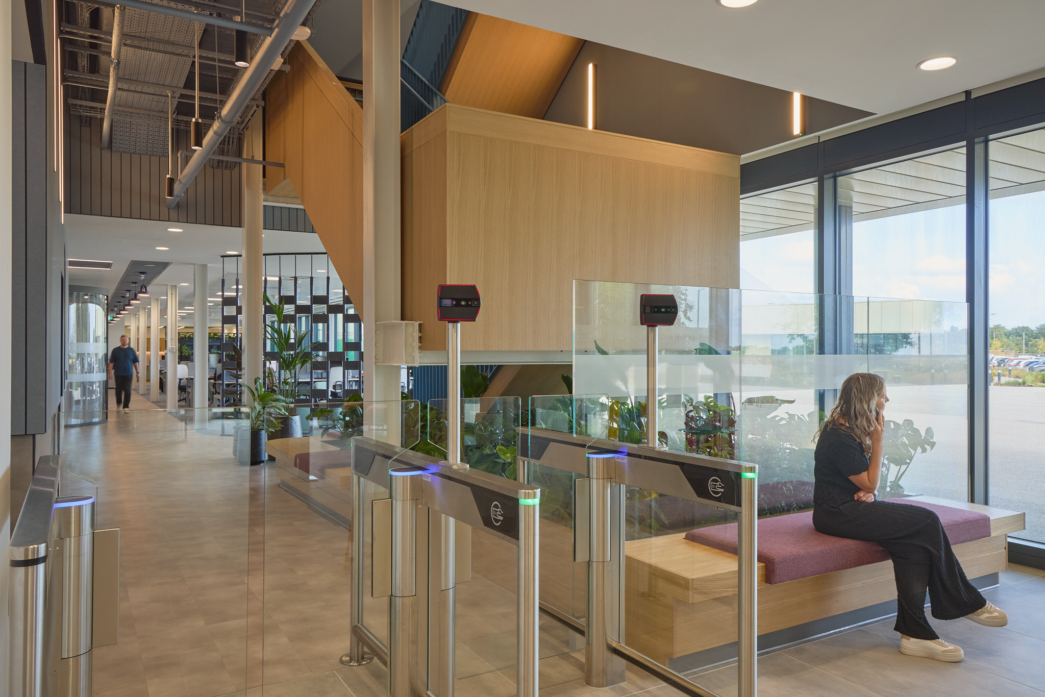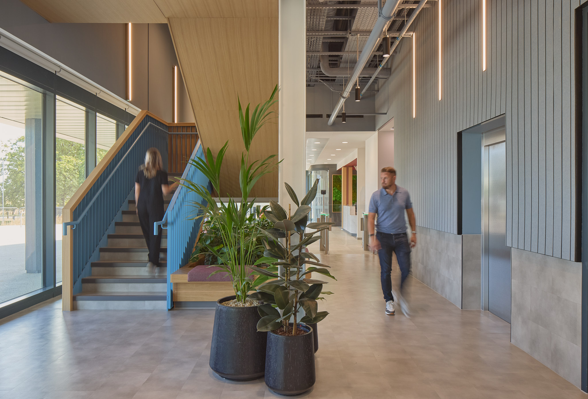 The concept comes alive through details like the feature lighting along corridors, designed to resemble mRNA strands when viewed from the side – a subtle but powerful reminder of the innovative work taking place within.