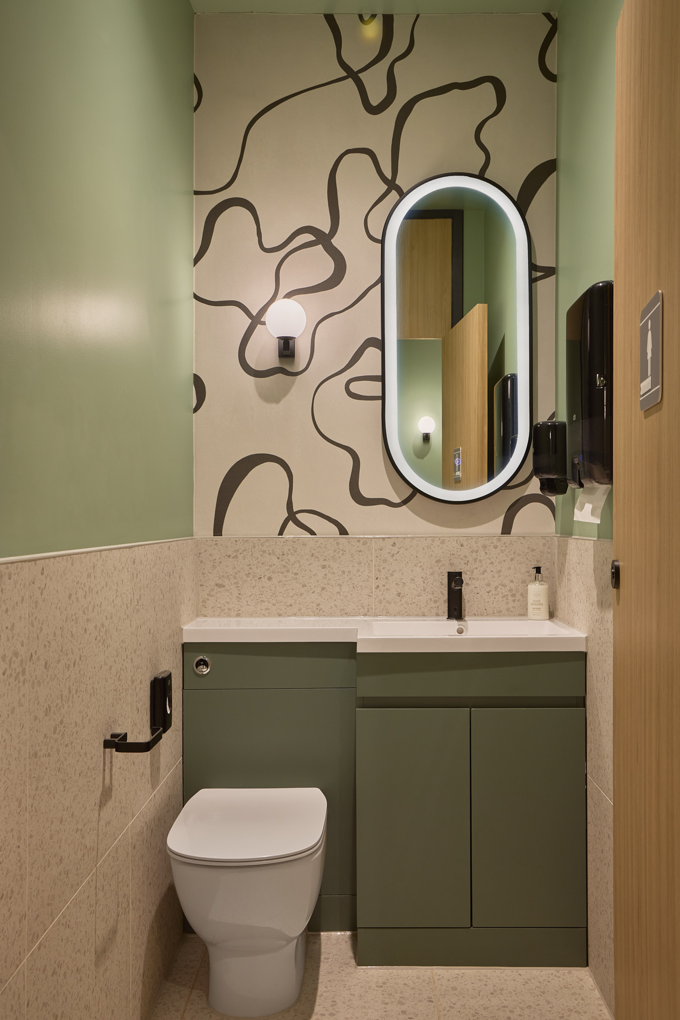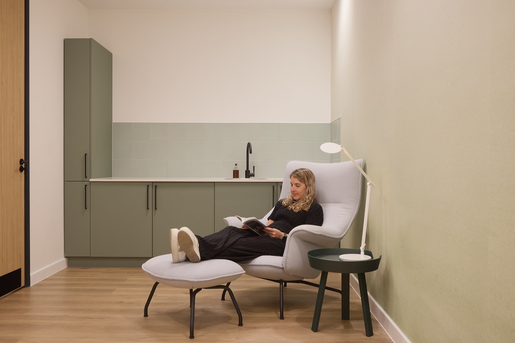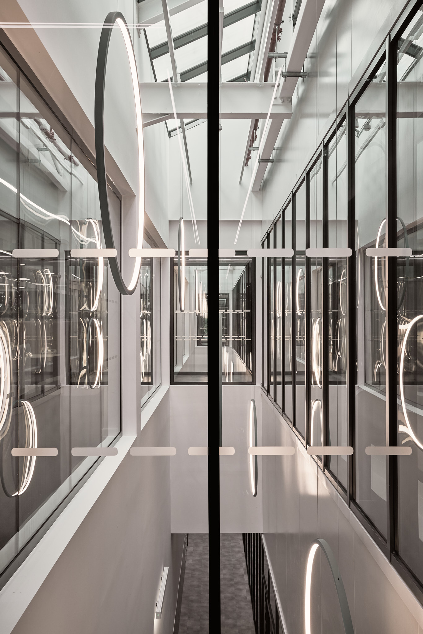 The concept comes alive through details like the feature lighting along corridors, designed to resemble mRNA strands when viewed from the side – a subtle but powerful reminder of the innovative work taking place within.