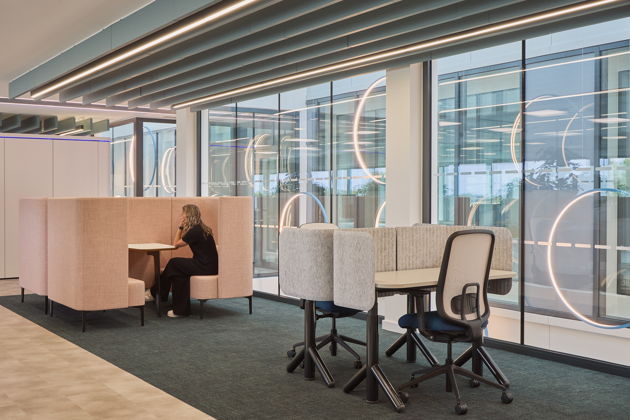 Beyond technical solutions, the design centred on people. Tétris created a bespoke workspace that reflects Moderna's values while supporting team wellbeing and productivity. The design concept draws directly from Moderna's mission: "to deliver the greatest possible impact to people through mRNA medicines." Just as mRNA carries information essential for function, each area of the floor plan is designed to express the company’s values – with spaces working together like elements of a connected whole.