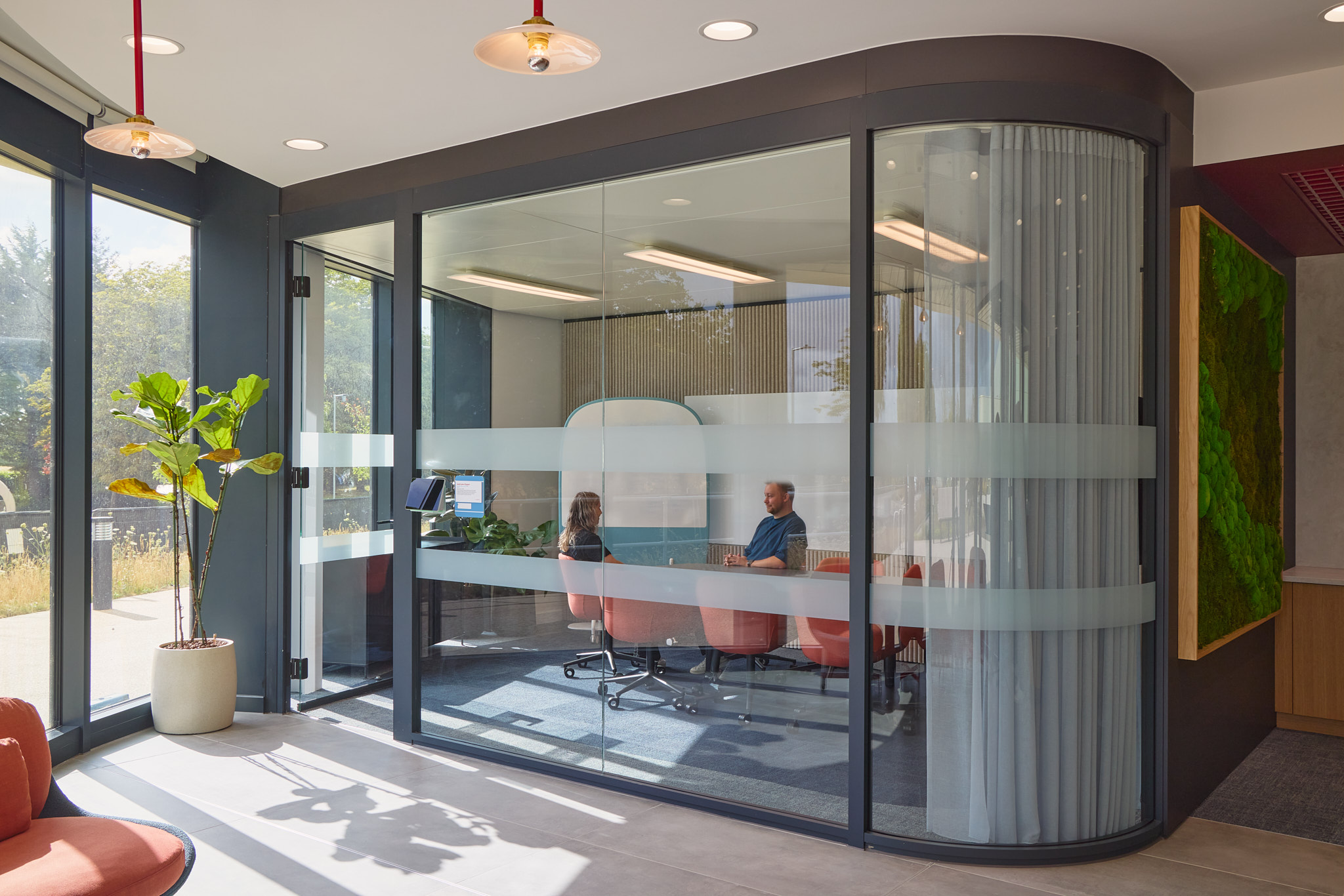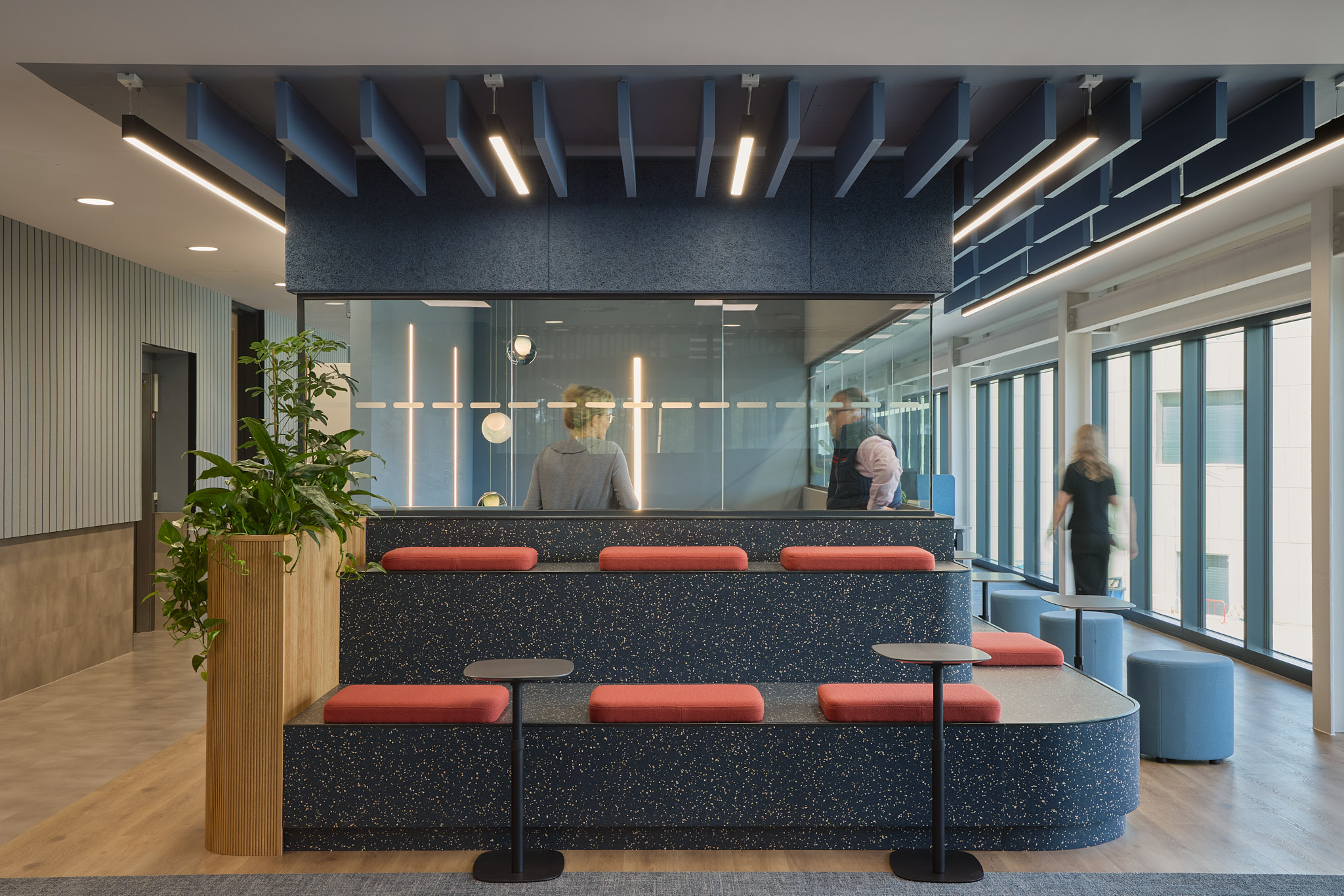 The goal was to create a modern, collaborative workplace that would not only embody Moderna’s innovative corporate identity but also provide a supportive and inspiring environment for the scientists, researchers, and staff working to deliver Moderna’s mission. This required a design that could be seamlessly integrated within a new-build shell that also houses prefabricated modular laboratories, presenting unique structural, acoustic, and logistical complexities.