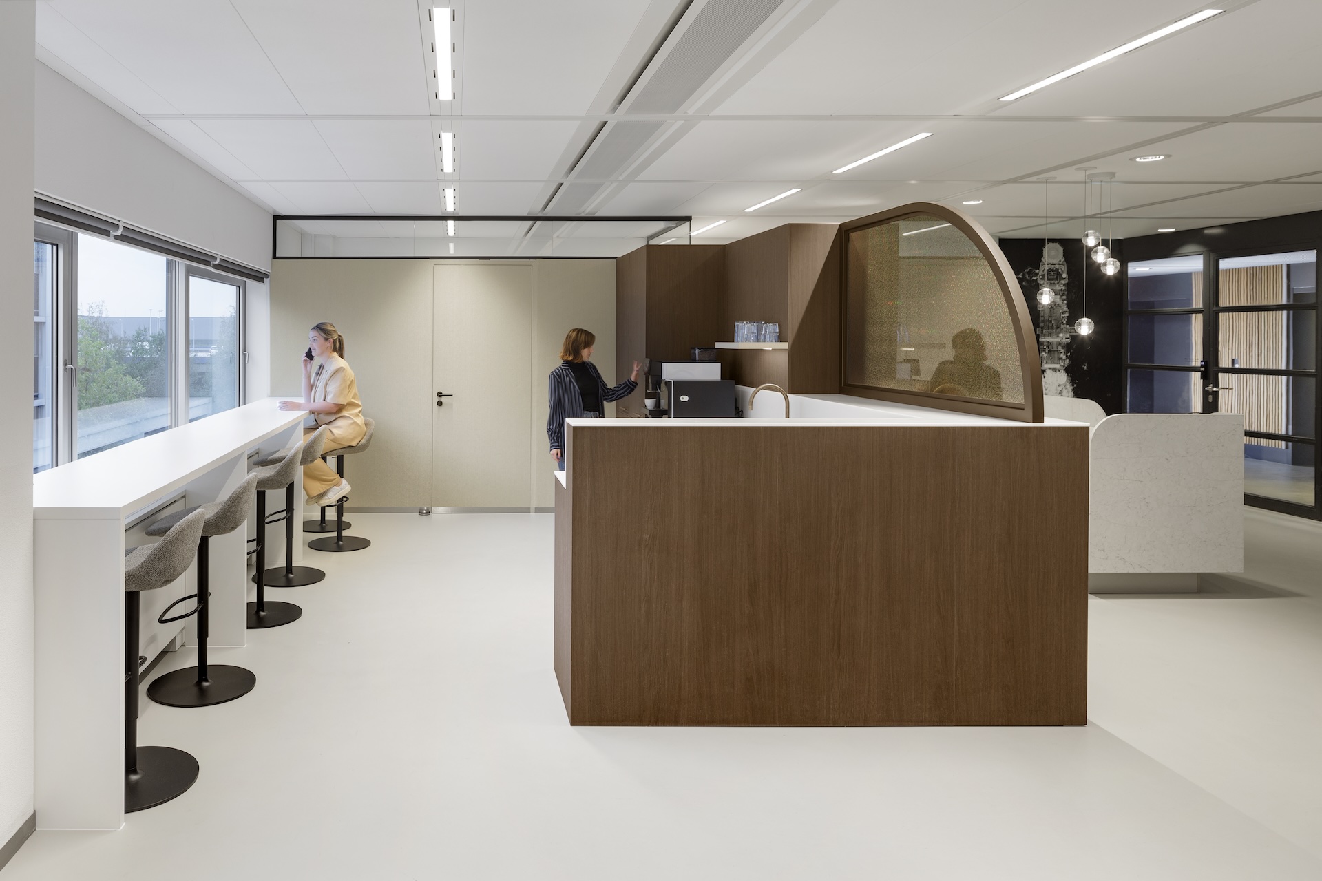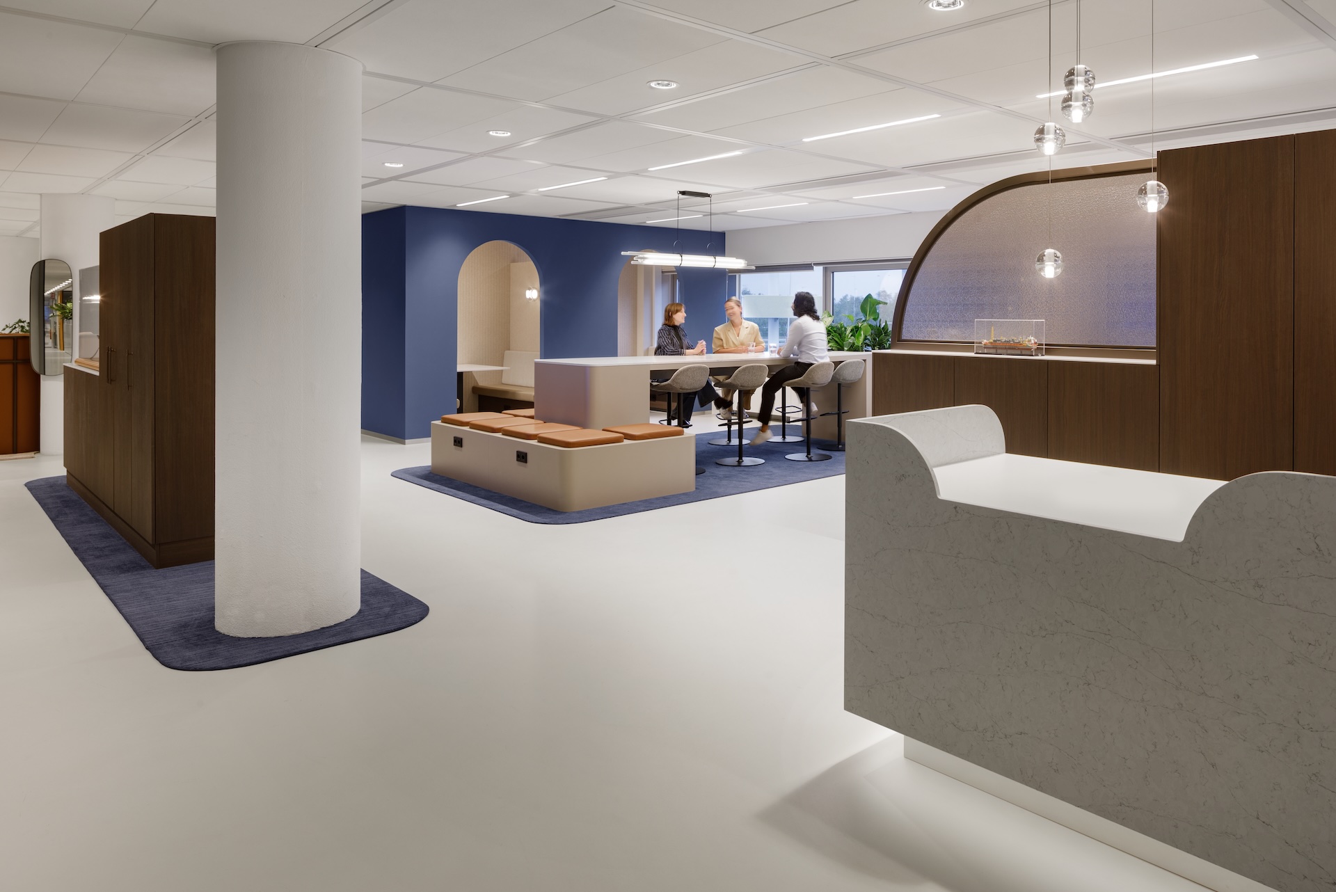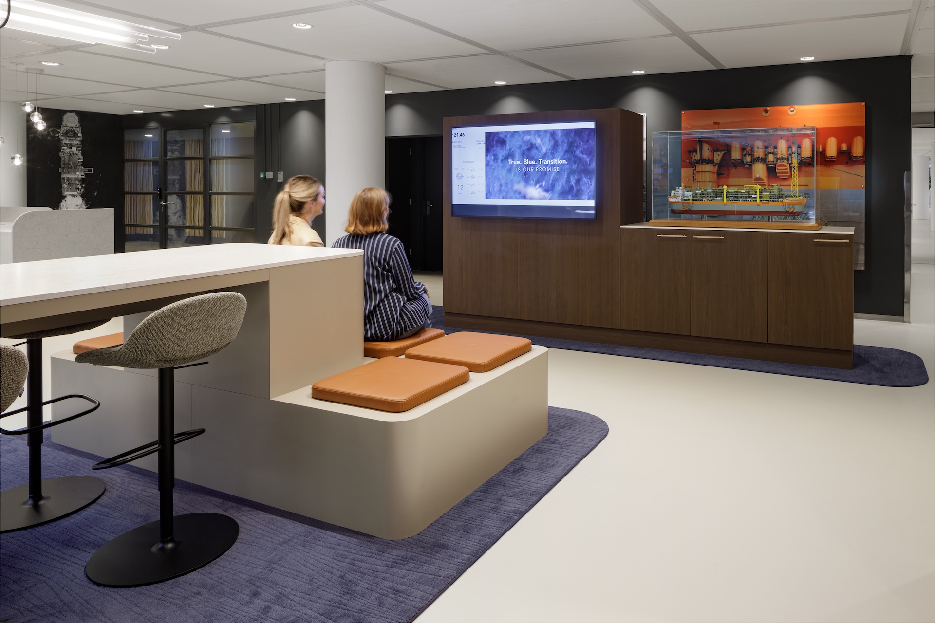 SBM’s brand story is thoughtfully woven throughout. The central bar, inspired by SBM’s ships, features tiling echoing ship hulls, anchor-line motifs, and bubble-like lighting. Orange cues in the wayfinding highlight SBM’s offshore heritage. Elements from Rotterdam’s Markthal and port give staff a sense of belonging and pride in both their company and city.