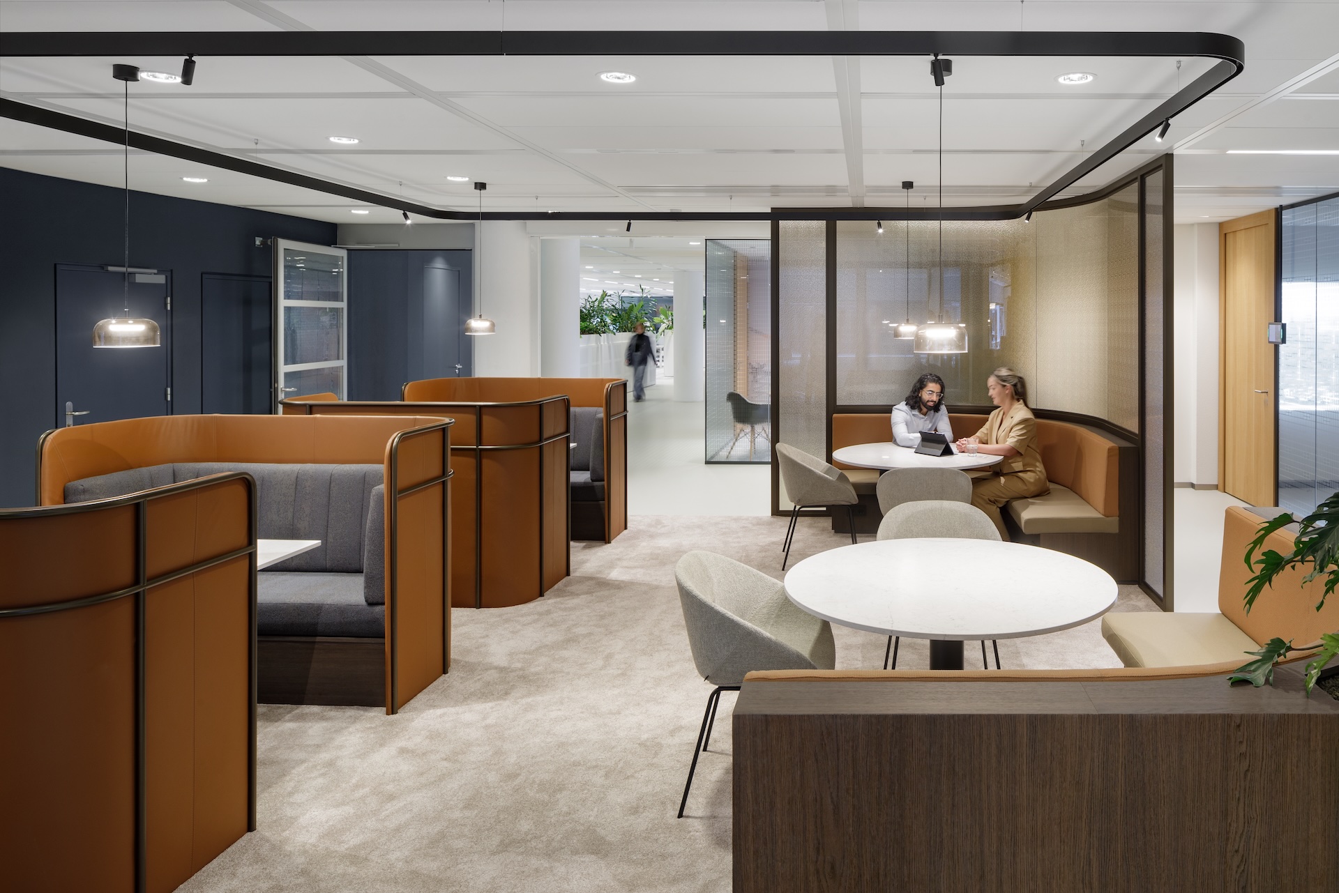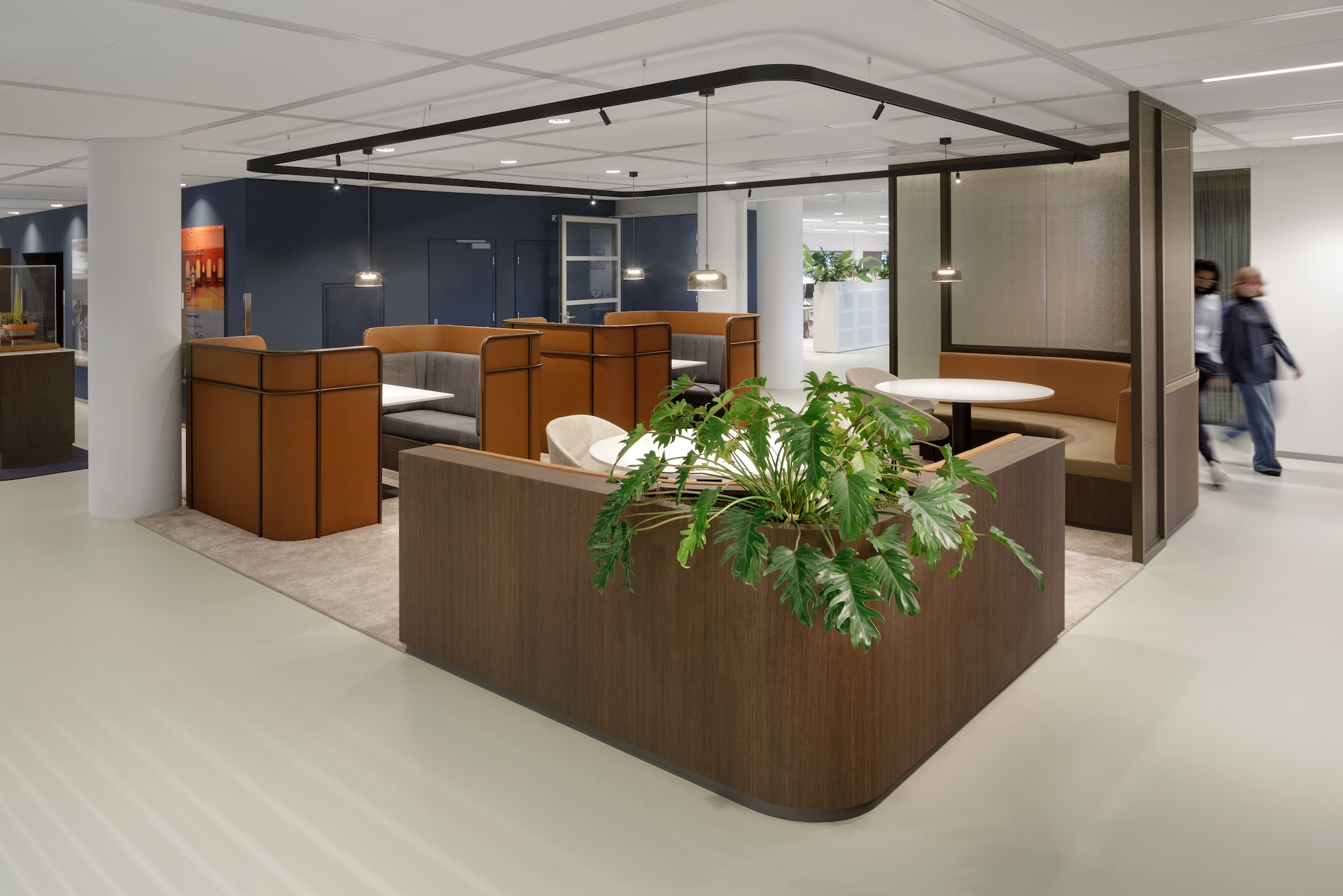 At the center of the transformation is a vibrant, 1000m² work café, modelled after Rotterdam’s bustling city center. This central hub serves as the office’s social heart, bringing together a mix of quiet library zones, collaborative meeting areas, and lively spaces for informal interaction. The hub fosters valuable connections, whether through focused work, coffee chats, or team gatherings.