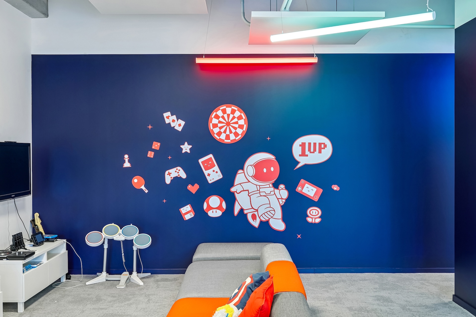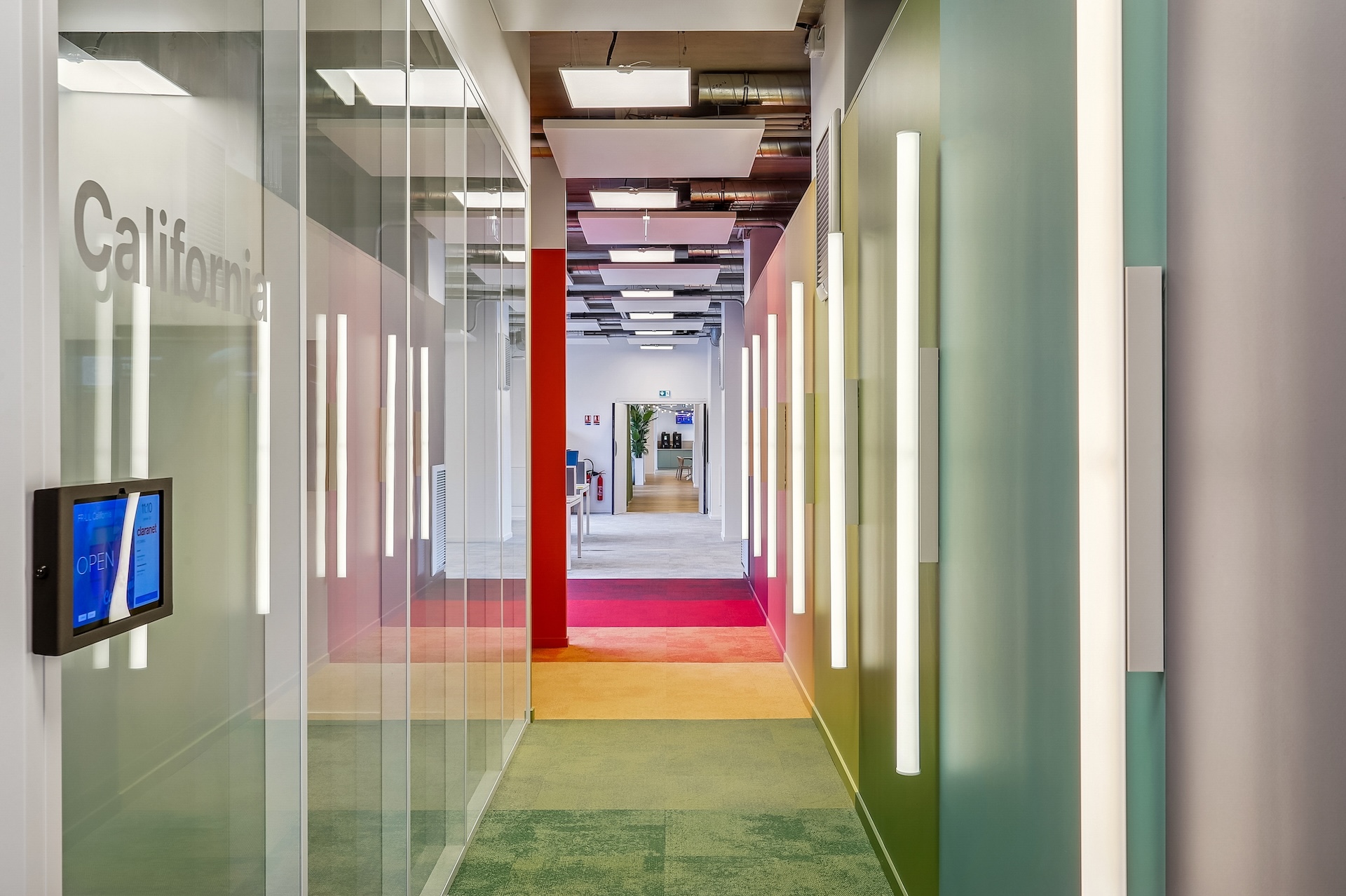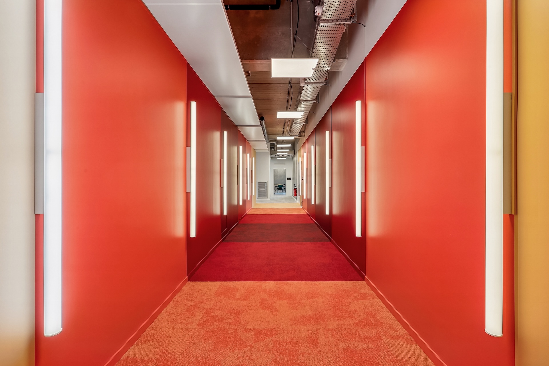 Deux “Gates” marquent les transitions. Une première, rouge, affirme l’expérience client dès l’arrivée. Une seconde, verte, introduit un univers plus collaboratif et orienté bien‑être. Les espaces de travail restent volontairement sobres afin de favoriser la concentration. Les espaces de vie expriment, quant à eux, davantage la créativité et l’énergie de l’entreprise.