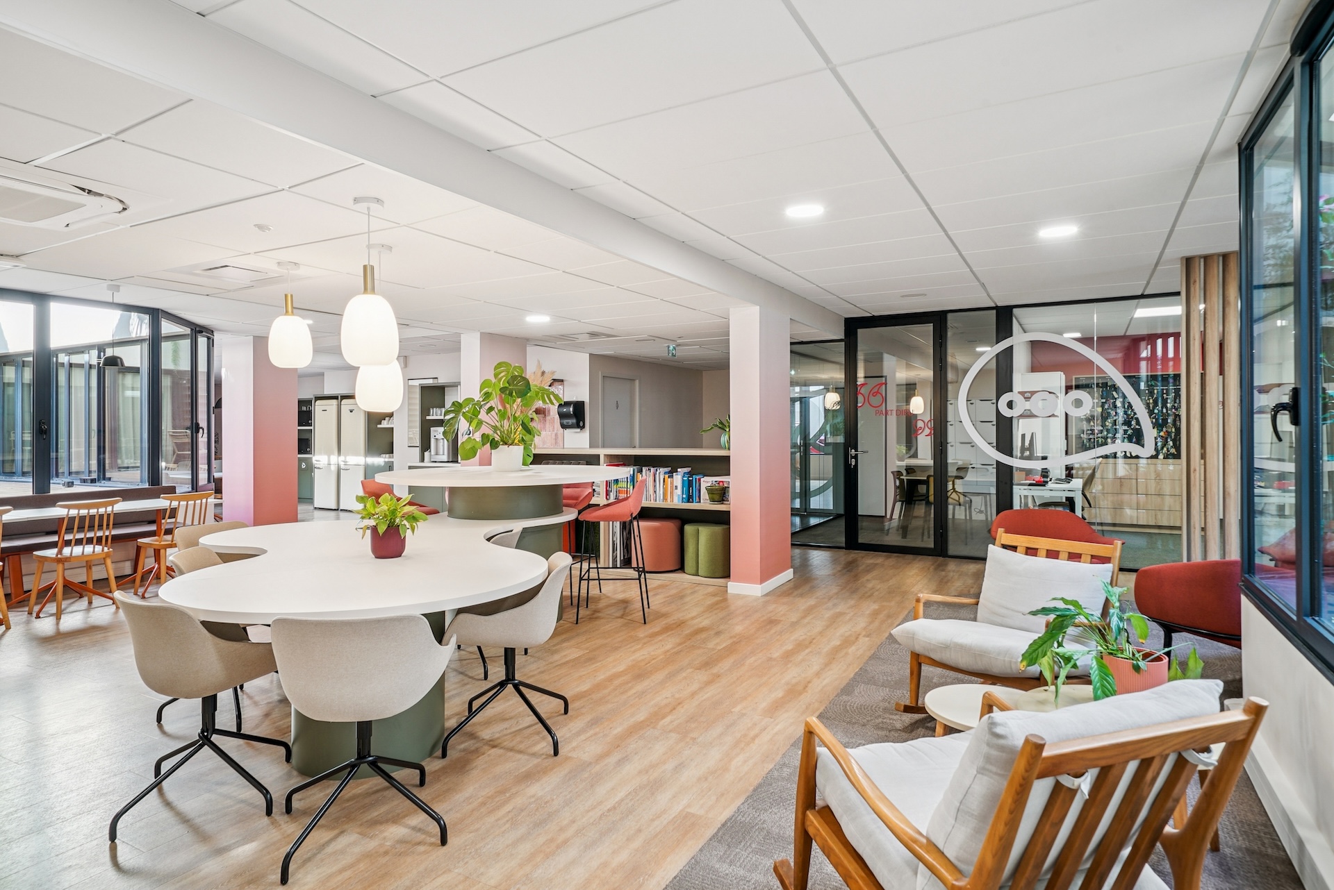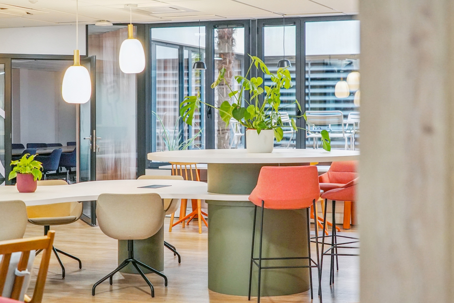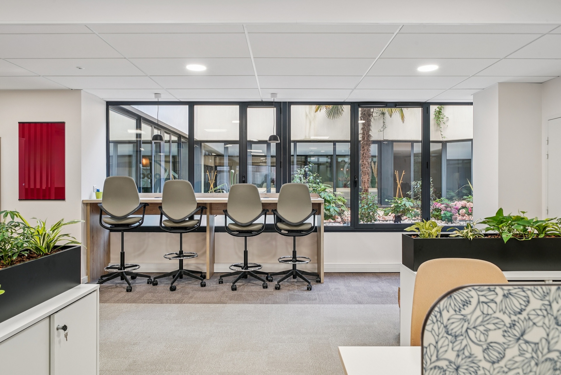 Le résultat final, unanimement salué par les équipes, offre un cadre qui allie modernité et convivialité. Deux patios centraux repensés et plusieurs terrasses inondent les espaces de lumière naturelle, créant un lien harmonieux avec l'extérieur, renforcé par une végétalisation soignée. Les cloisons vitrées et les matériaux naturels créent une atmosphère professionnelle et accueillante. Les lignes organiques du mobilier insufflent douceur et fluidité. Les équipes design ont intégré des typologies d'usage variées : des espaces ouverts favorisant la collaboration et des zones dédiées à la concentration. L'accueil, avec son rouge symbolique, reflète l'identité de BATIGERE et projette l'image d'un bailleur tourné vers l'avenir.