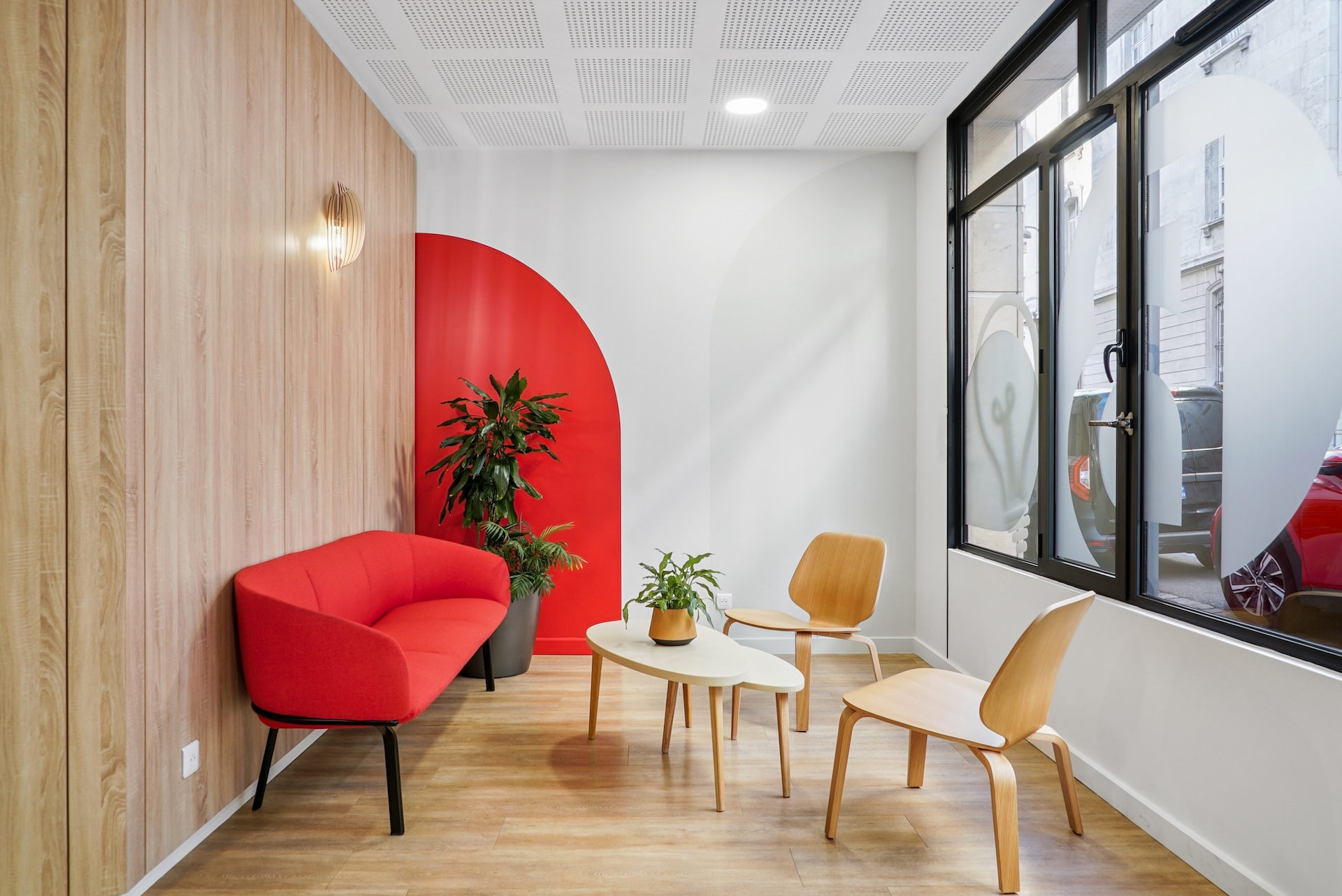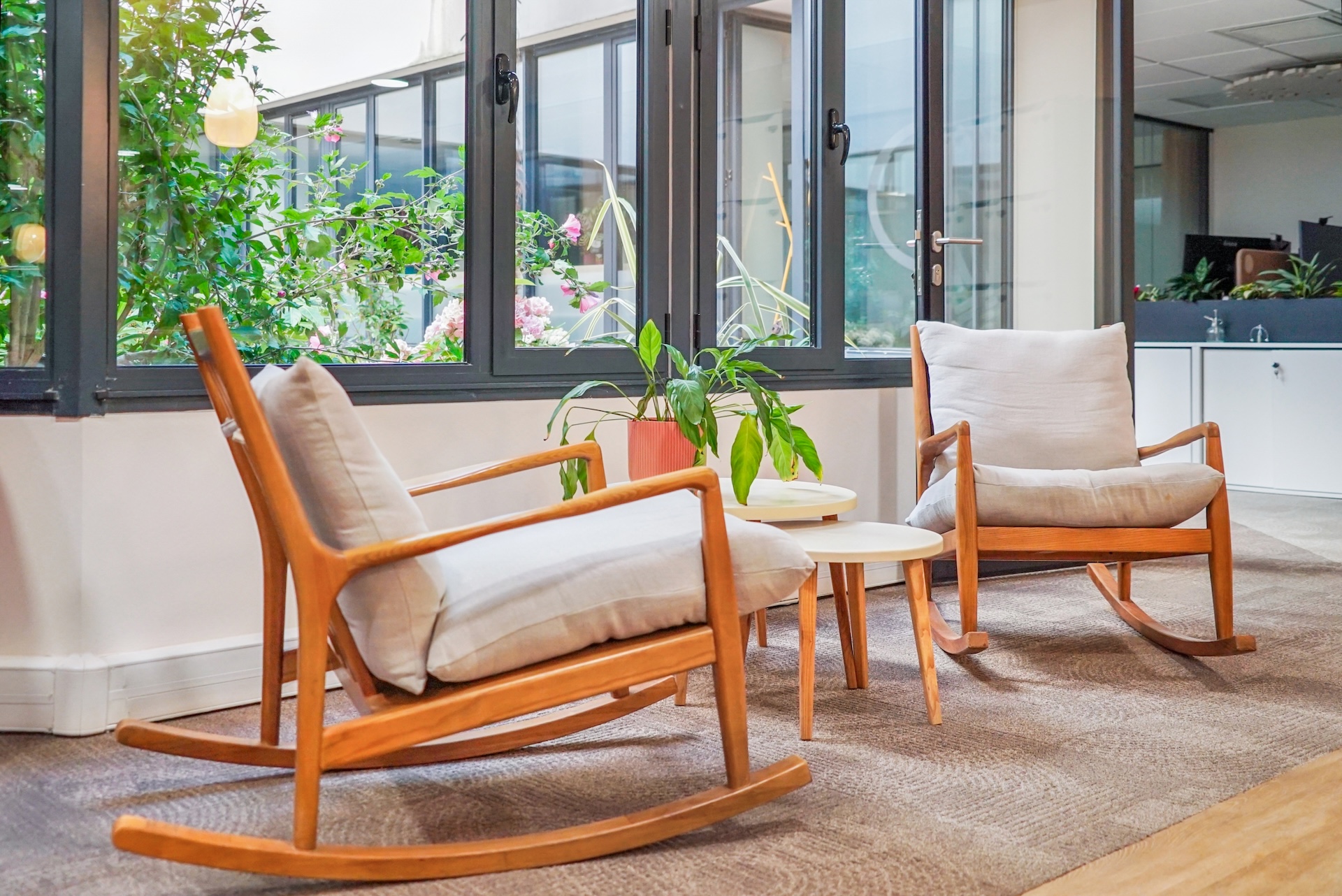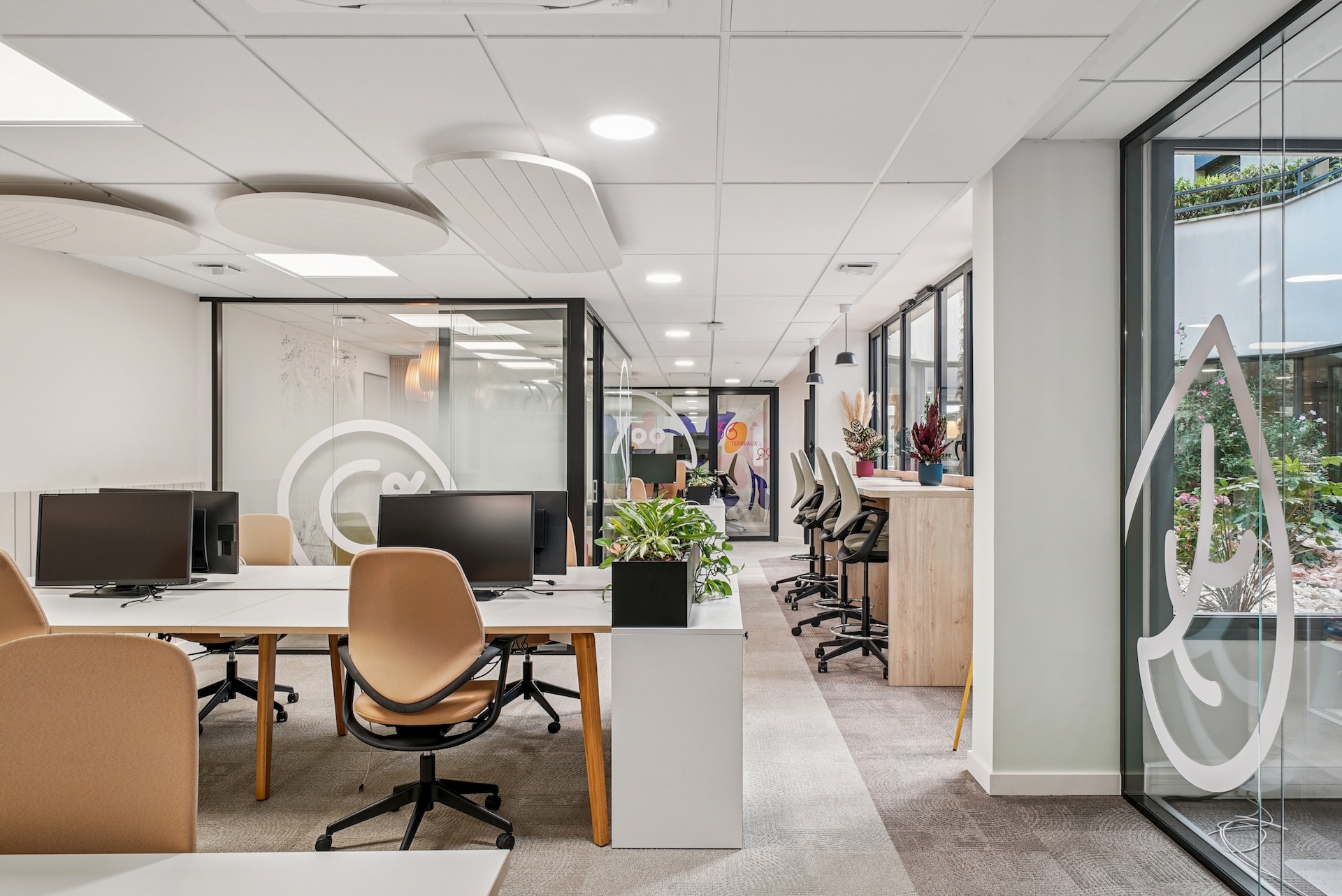 Le résultat final, unanimement salué par les équipes, offre un cadre qui allie modernité et convivialité. Deux patios centraux repensés et plusieurs terrasses inondent les espaces de lumière naturelle, créant un lien harmonieux avec l'extérieur, renforcé par une végétalisation soignée. Les cloisons vitrées et les matériaux naturels créent une atmosphère professionnelle et accueillante. Les lignes organiques du mobilier insufflent douceur et fluidité. Les équipes design ont intégré des typologies d'usage variées : des espaces ouverts favorisant la collaboration et des zones dédiées à la concentration. L'accueil, avec son rouge symbolique, reflète l'identité de BATIGERE et projette l'image d'un bailleur tourné vers l'avenir.