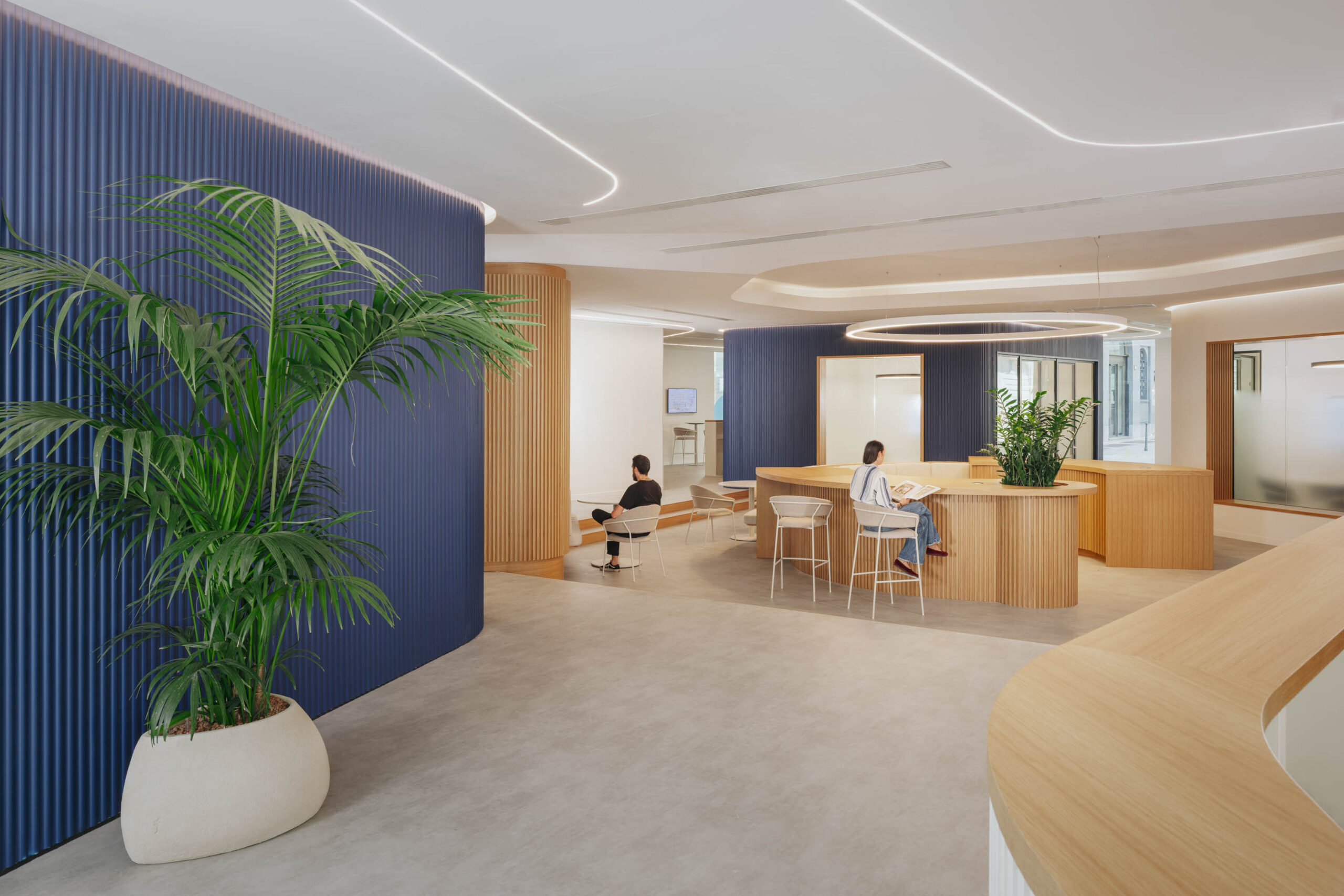 Le finiture rivelano una progettazione materica sofisticata che crea un’esperienza sensoriale completa. Il legno di pavimenti, soffitti ed elementi decorativi si integra con tatami naturali, gres e ceramiche, rivestimenti metallici contemporanei e pannelli in fibra naturale per il comfort acustico. Tessuti morbidi, tendaggi trasparenti e arredi imbottiti completano un ambiente che garantisce benessere psico-fisico, supportando diverse modalità d’uso durante la giornata lavorativa.