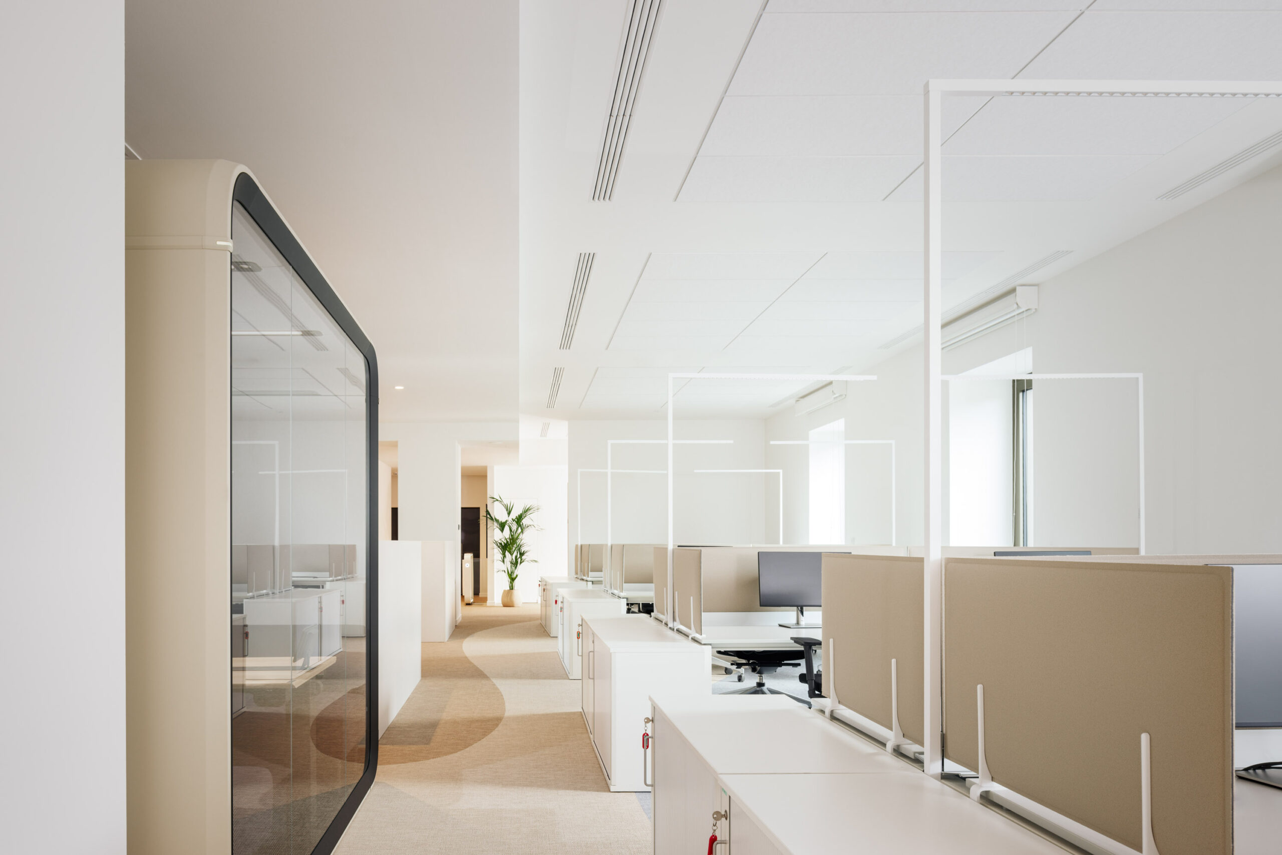 Il progetto integra soluzioni innovative che supportano le nuove modalità di lavoro: postazioni regolabili in altezza, aree di collaborazione flessibili, tecnologia avanzata nelle sale riunioni con schermi integrati e sistemi di prenotazione digitali.