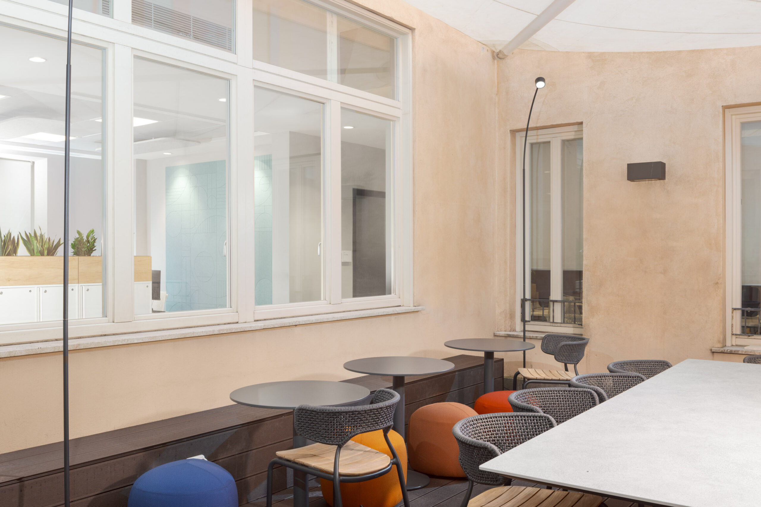 La terrazza lounge, spazio all’aperto destinato sia alle attività lavorative che ai momenti di relax, introduce una dimensione che arricchisce l’esperienza degli utenti e favorisce il contatto con l’ambiente esterno. La presenza del verde, attraverso piante ed elementi vegetali, migliora la qualità dell’ambiente, e crea una continuità visiva tra interno ed esterno.