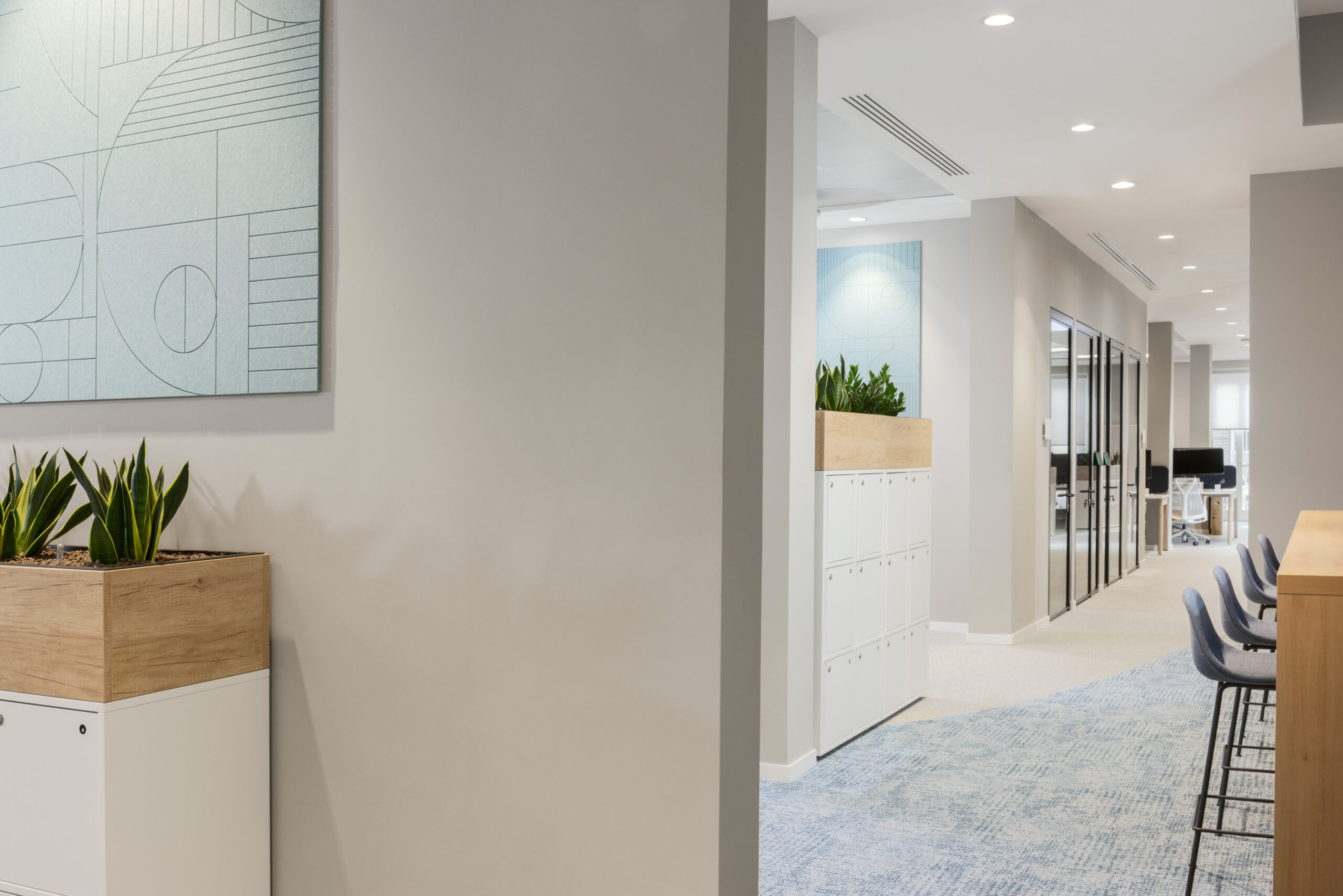 Le scelte cromatiche alternano tonalità neutre (bianco, grigi, blu) e accenti che richiamano l’identità aziendale, offrendo coerenza visiva e rafforzando il senso di appartenenza. Materiali e arredi selezionati contribuiscono a definire un’atmosfera professionale e confortevole, in linea con i più alti standard di design.