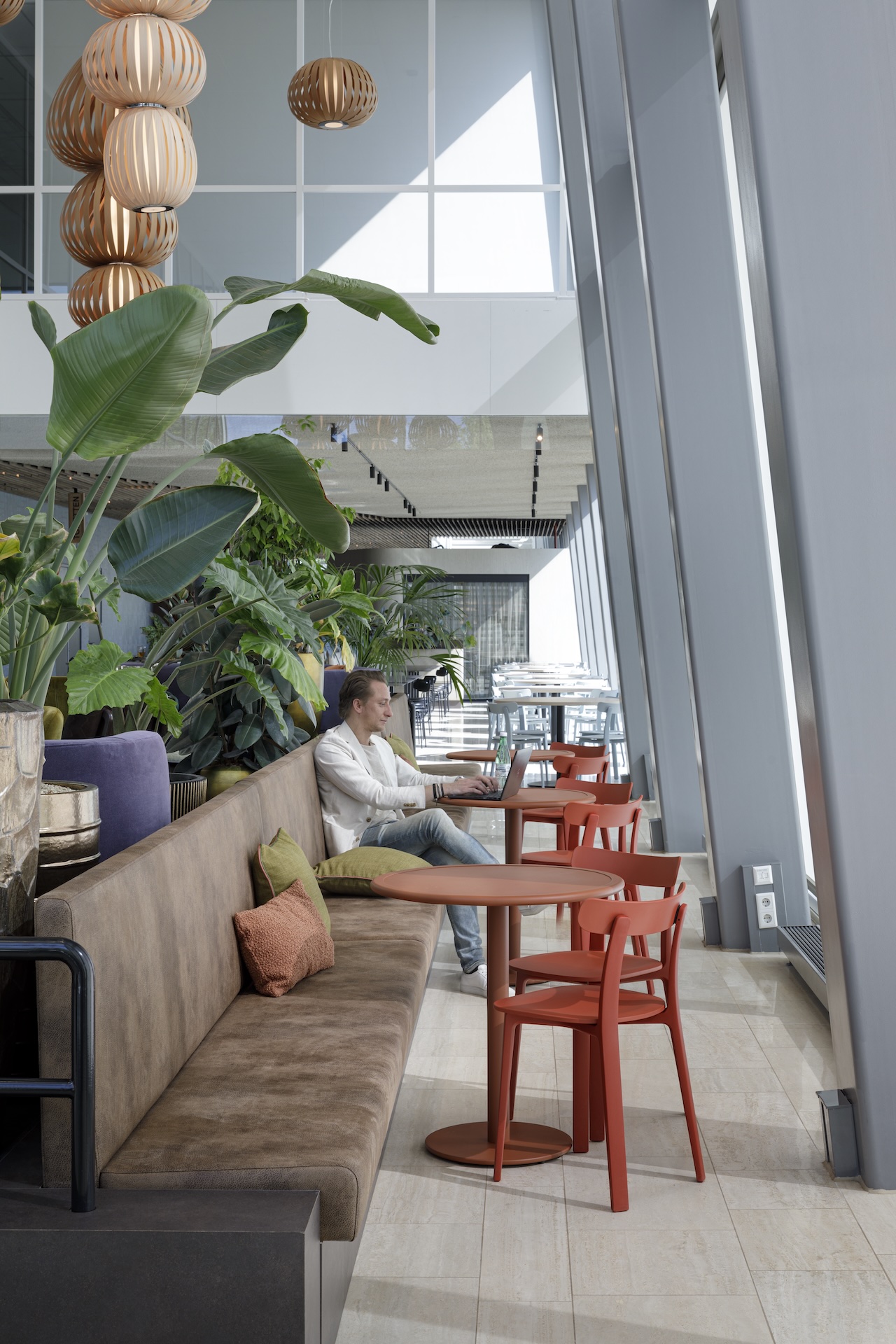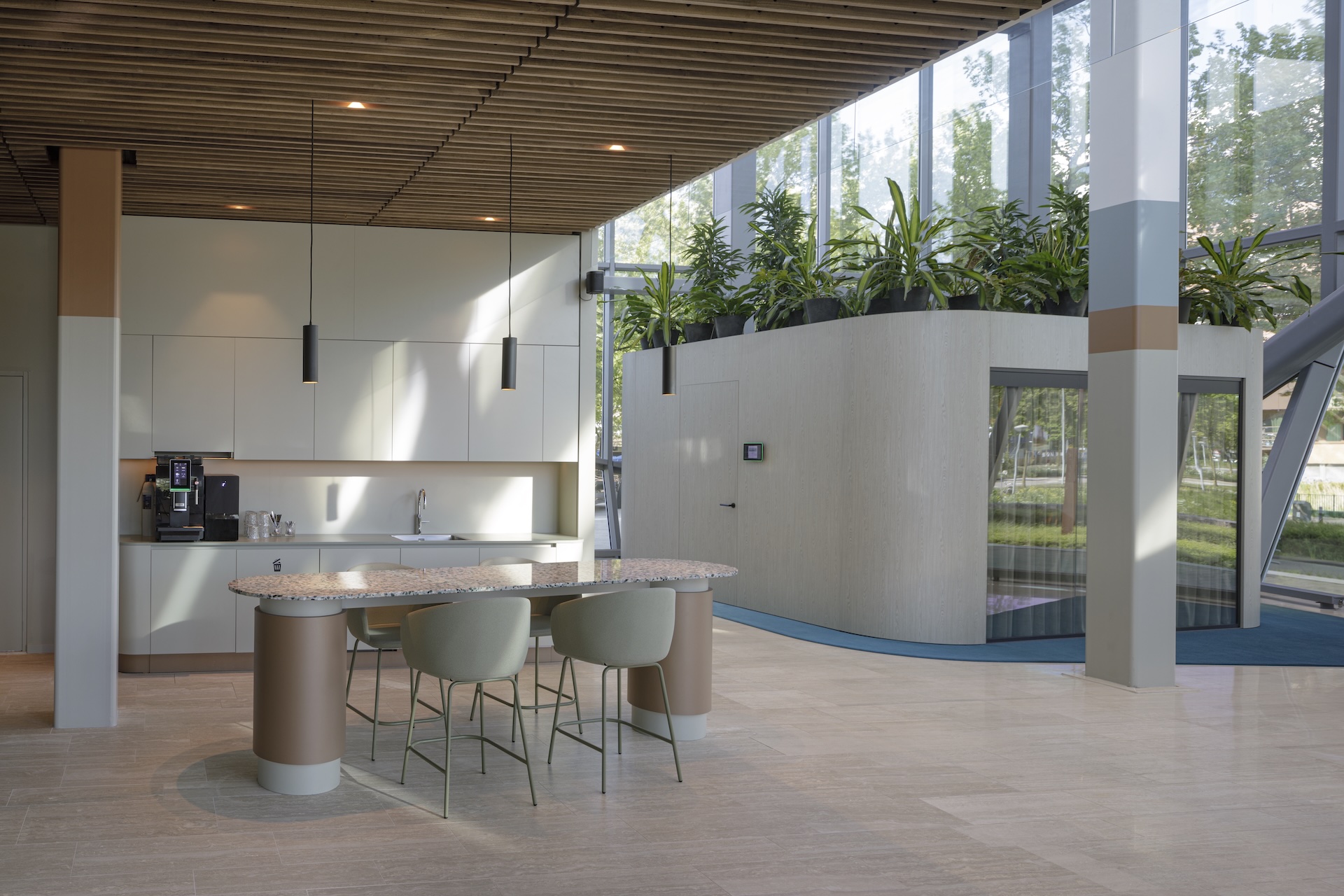 Het restaurant biedt gezonde lunchopties en premium koffie, wat bijdraagt aan werknemertevredenheid. Dit multifunctionele concept speelt in op moderne werkplekontwikkelingen waar de grenzen tussen eten, vergaderen en werken vervagen. Het resultaat verhoogt huurdertevredenheid terwijl het ruimtegebruik optimaliseert.